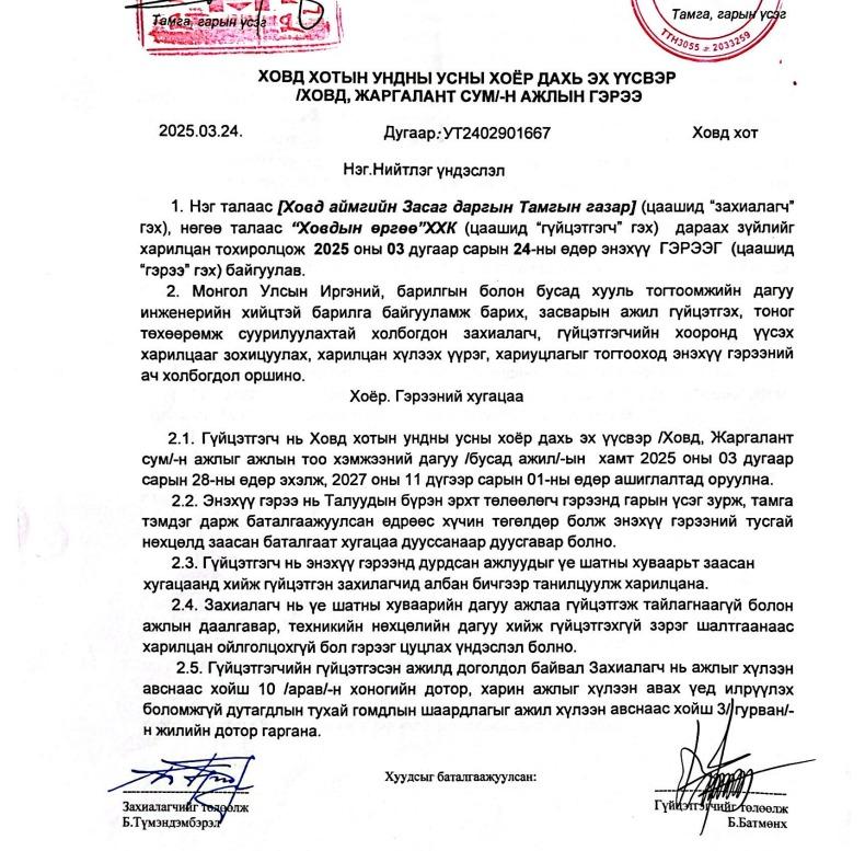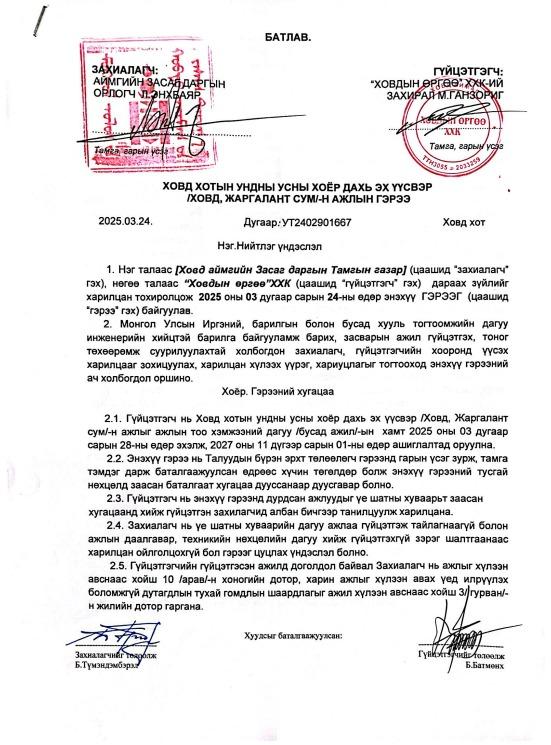 Хамгийн сүүлд шалгарсан буюу 38.0 тэрбум төгрөгийн “Ховд хотын ундны усны хоёр дахь эх үүсвэр байгуулах ажил”-ын гэрээг өнгөрөгч гуравдугаар сарын 24-нд байгуулсан бөгөөд Ховд аймгийн Засаг даргын орлогч Л.Энхбаяр, “Ховдын өргөө” ХХК-ийн Гүйцэтгэх захирал М.Ганзориг хоёр гарын үсэг зурж гэрээг баталгаажуулжээ.